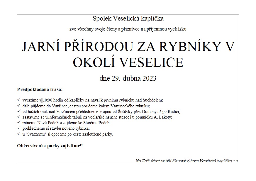 Jarní turistická vycházka 1 Tradiční jarní vycházka v okolí Veselice.